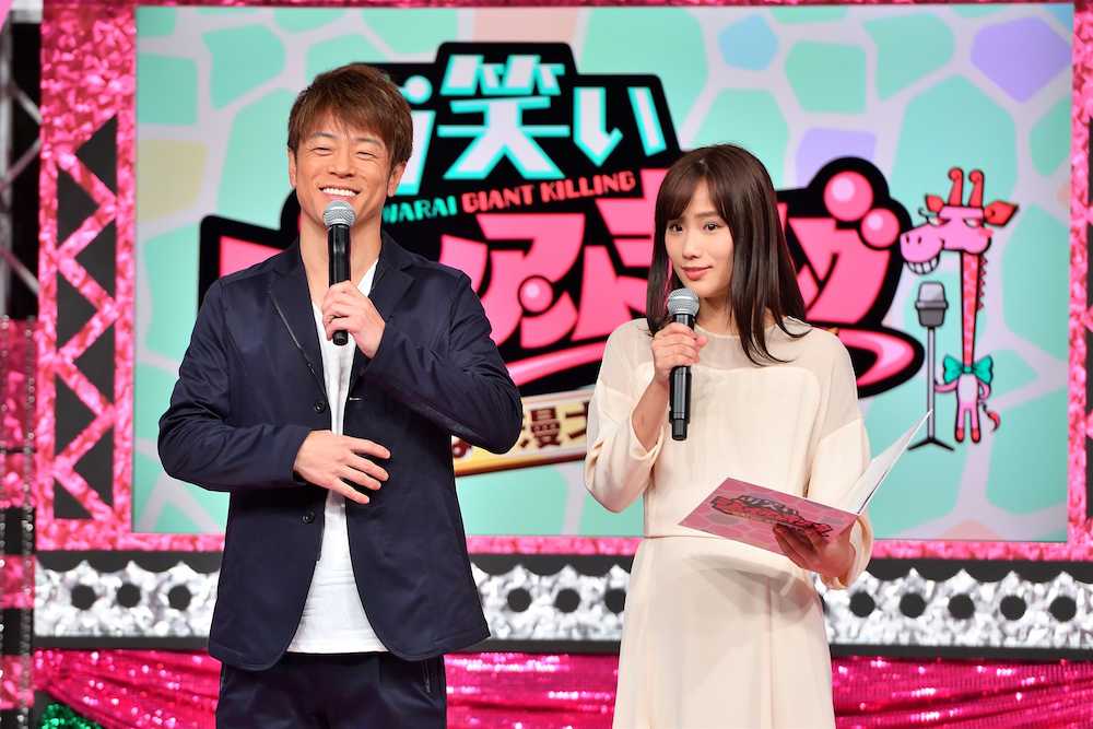 MBSテレビ「お笑いジャイアントキリング〜しばり漫才王決定戦〜」のMC陣内智則(左)、アシスタントの秋山ゆずき