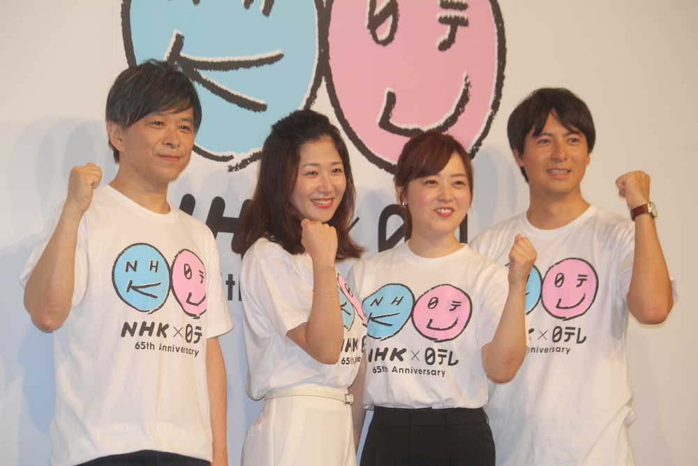 NHKの武田真一(50)、桑子真帆(31)、日テレの桝太一(37)、水卜麻美(31)各アナが14日、都内で行われた「テレビ放送65周年NHK×日テレ コラボデー」記者会見に出席した。