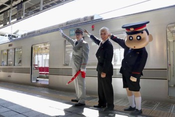 その後ホームでは、新メロディーを受けて、午前11時14分に東武動物公園発中目黒行きの電車が発車した。東京都東大和市の男性会社員(28)は「小さい頃からしんちゃんを見てきたのでうれしい」と話した。