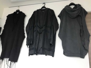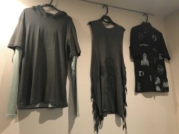 自宅のリビングと寝室、廊下の壁に洋服がかかっている。タンクトップやパーカ、スエットなど計13着で、全てラフ・シモンズ製。95年、ベルギーのデザイナーが自身の名を冠して立ち上げたメンズブランドだ。