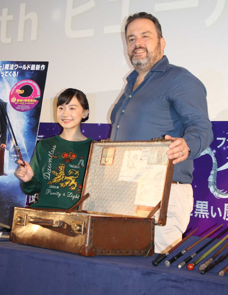 最新作「ファンタスティック・ビーストと黒い魔法使いの誕生」が11月23日に公開。芦田は同作のスペシャルアンバサダーを務める。イベントには来日した小道具の魔術師と呼ばれるピエール・ボハナ造詣美術監督も参加。「ファンタビ」や「ハリー・ポッター」シリーズなど近年のハリウッド超大作の小道具制作を担当しているピエール氏は芦田をイメージして作ったという世界に一つだけの魔法の杖をサプライズプレゼント。同作品の大ファンの芦田は「すごーい。うれしすぎてちょっと何て言葉にしたらいいかわからないです…!宝物にします」と大感激。「小学校の時に周りの友達に杖を持っている子がいて羨ましかったんですけど…。自分専用の杖なんて本当にありがとうございます」と大喜びだった。