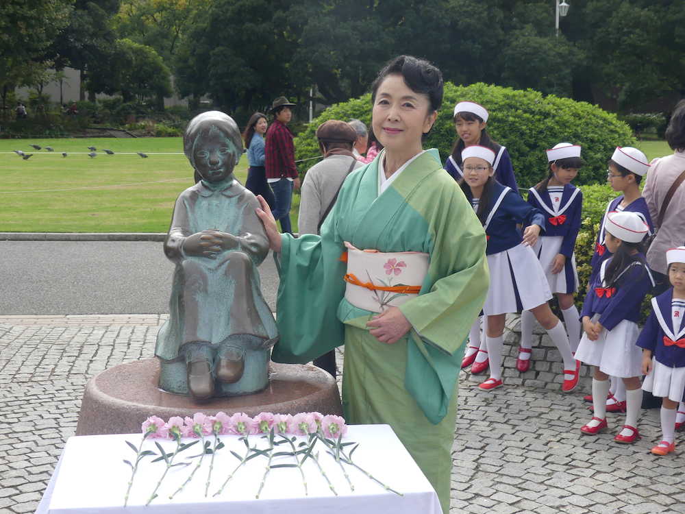 この日は童謡「赤い靴」を作曲した本居長世の命日。像の前で献花をするとともに「赤い靴ジュニアコーラス」の子供らと同曲などを合唱した。同舞台は「赤い靴」のモデルになった少女と母の真実を描く物語。「横浜から親子の絆を日本中に発信したい」と力を込めた。