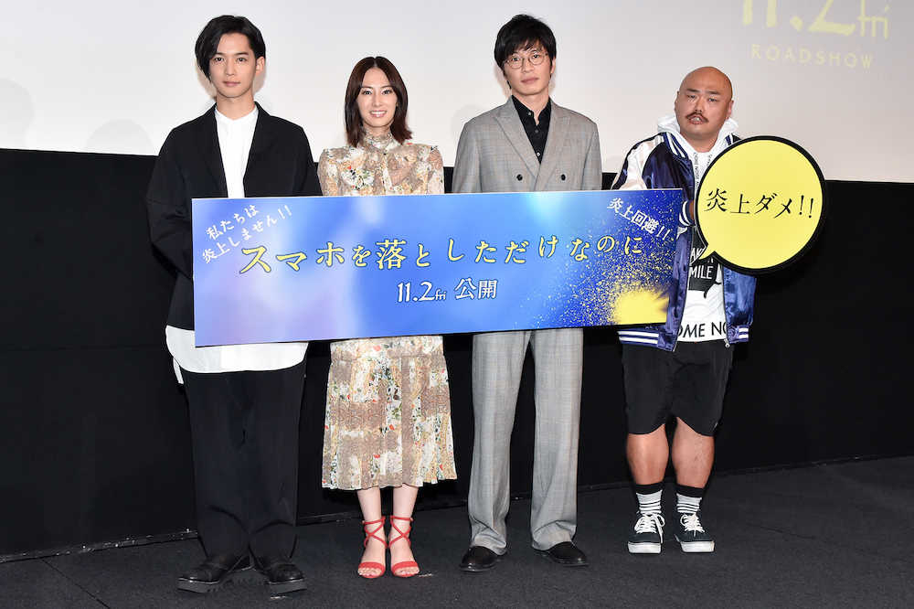映画「スマホを落としただけなのに」公開直前イベントに出席した(左から)千葉雄大、北川景子、田中圭、クロちゃん