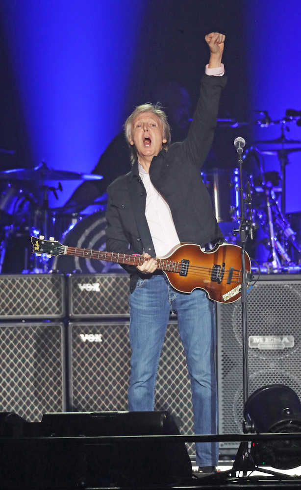 開演予定を15分過ぎた午後6時45分、故ジョン・レノンさんとビートルズ時代に共作した名曲「ア・デイ・イン・ザ・ライフ」が流れると、ファンの歓声の中ポールが登場。1曲目で「ビートルズがやって来るヤァ!ヤァ!ヤァ!」を披露すると「コンバンハ、トーキョー!タダイマ!」と日本語であいさつ。「イエスタデイ」「ヘイ・ジュード」や、日本初披露の「フロム・ミー・トゥ・ユー」などザ・ビートルズの楽曲21曲を含む36曲で、年齢を感じさせない高音のシャウトを聴かせた。