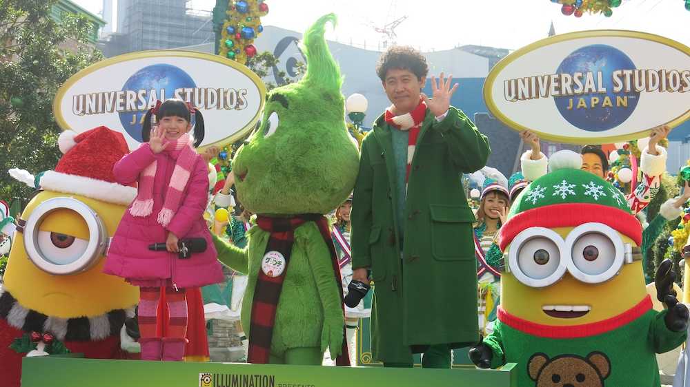 日本語吹き替え版で少女シンディー・ルー役の横溝菜帆(10)がクリスマスコスチュームに身を包んだミニオンと一緒に姿を見せた。その後、主人公・グリンチ役の大泉は緑一色のベビーグリンチと一緒に姿を見せ「ひねくれ者のグリンチがクリスマスを盗んでやる」と宣言。「ミニオンクリスマス」を開催中で、ミニオンカラーのイエロー一色だった「ミニオンパーク」が一面、グリンチ色のグリーンに変えられた。