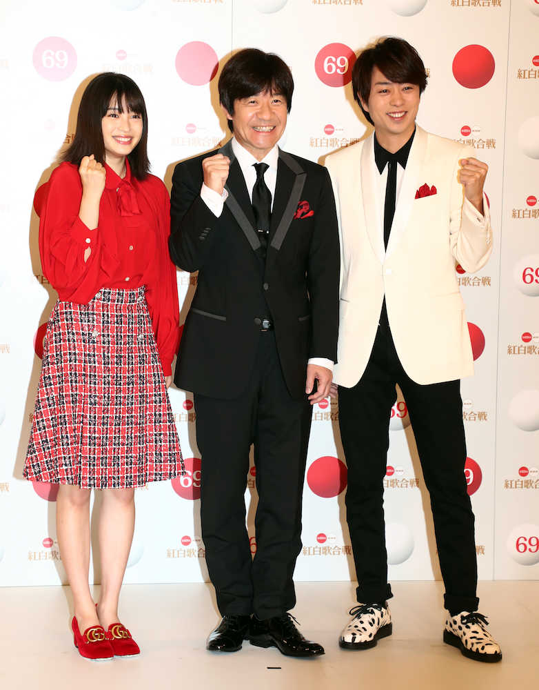 大みそかのNHK「紅白歌合戦」の紅組司会を務める女優・広瀬すず(20)、白組司会の嵐・櫻井翔(36)、総合司会のウッチャンナンチャン・内村光良(54)が26日、東京・渋谷の同局で会見した。