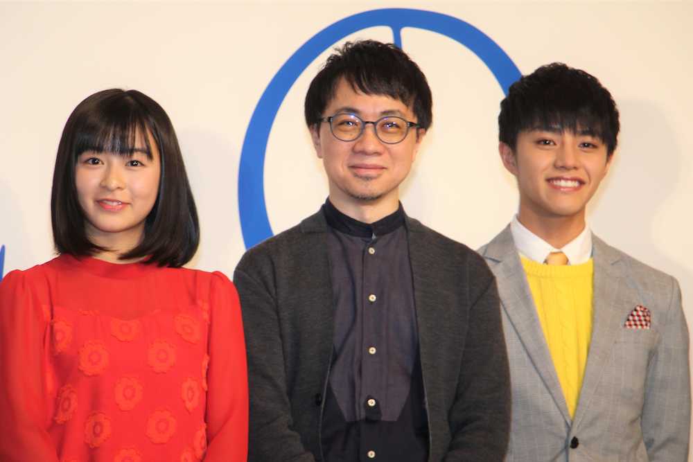 新海誠監督最新作「天気の子」製作発表記者会見に出席した(左から)森七菜、新海誠監督、醍醐虎汰朗