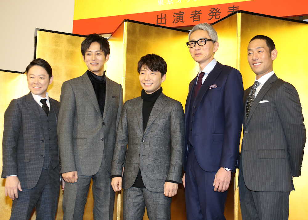 NHK大河ドラマ「いだてん」新キャスト発表会見に登場した(左から)阿部サダヲ、松坂桃李、星野源、松重豊、中村勘九郎