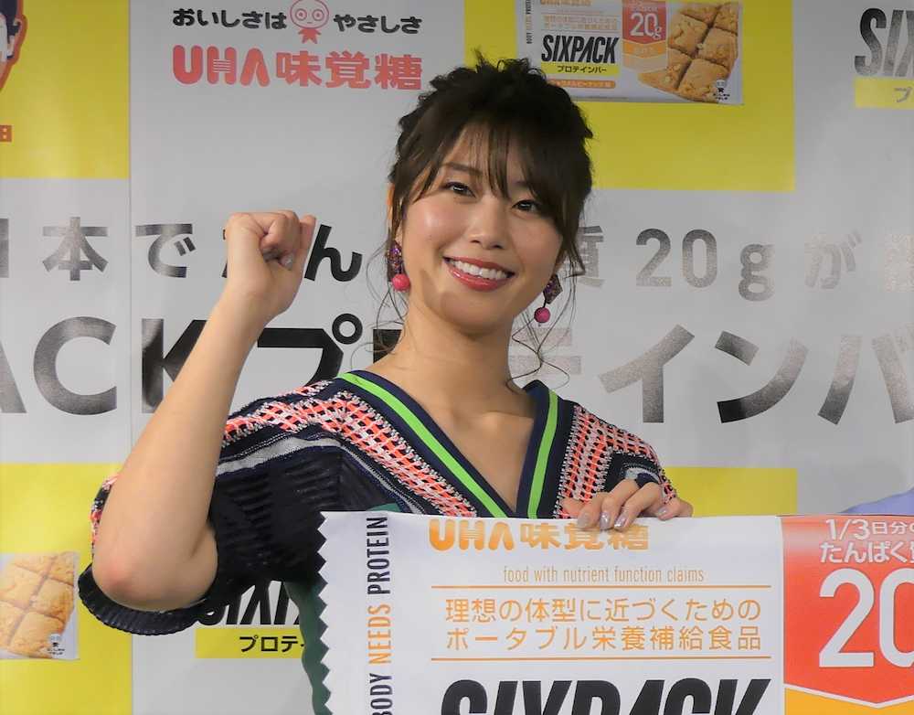 “神スイング”で知られるタレントの稲村亜美(22)が17日、都内でUHA味覚糖「SIXPACK プロテインバー」発売イベントに出席した。