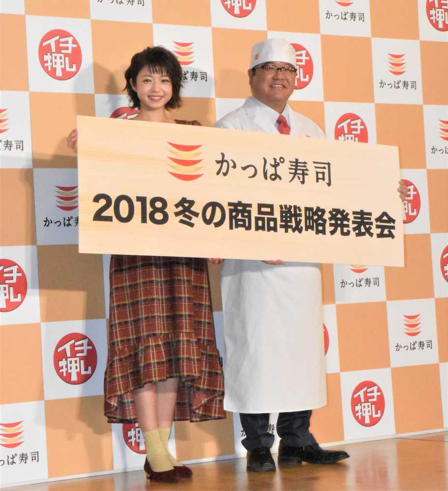 かっぱ寿司の商品戦略発表会に出席したカンニング竹山(右)と中村静香