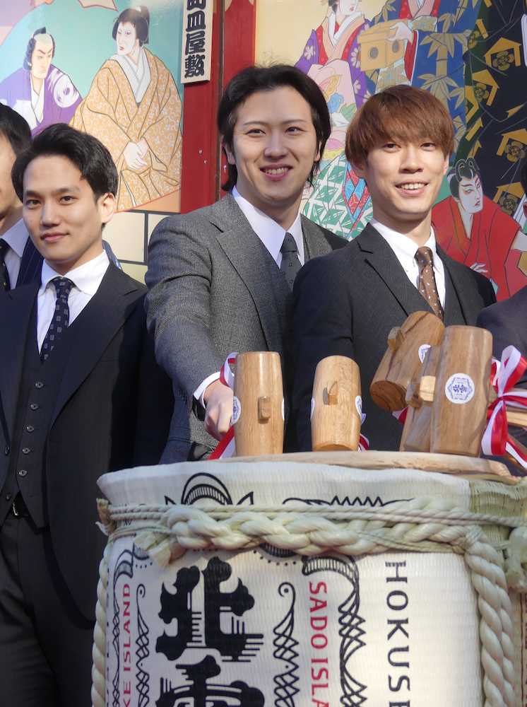 歌舞伎俳優の尾上松也(33)らが2日、東京・浅草公会堂で「新春浅草歌舞伎」(26日まで)の初日を迎えた。開場前には鏡開きを行い、来場者に祝い酒を振る舞った。