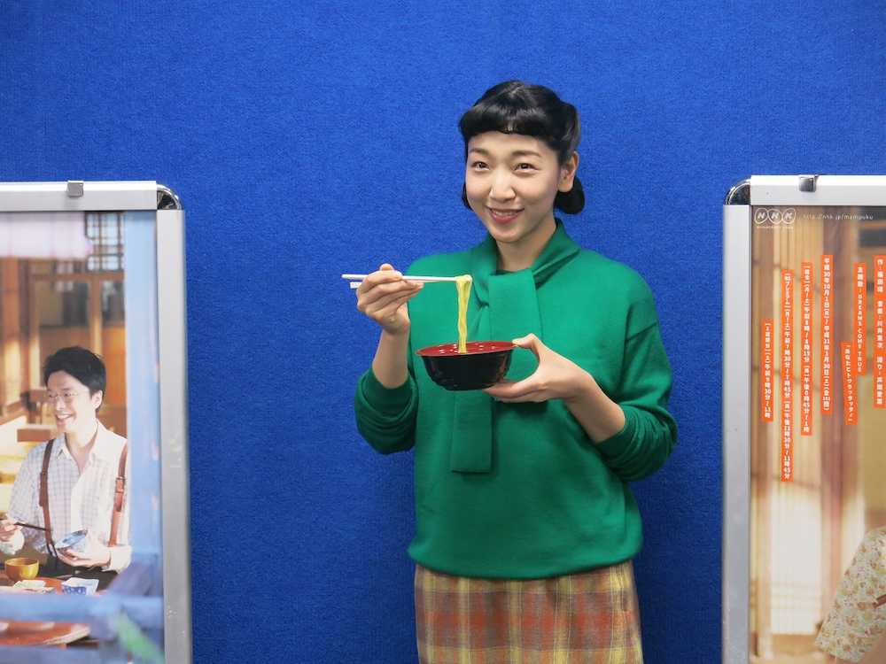 NHK連続テレビ小説「まんぷく」に出演中の安藤サクラがラーメンを手にしてニンマリ