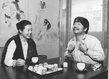 「まんが日本昔ばなし」で長年語り手を務めた市原悦子さんと常田富士男さん=1987年