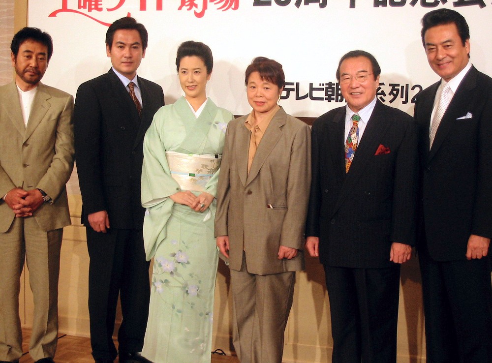 02年7月、テレビ朝日「土曜ワイド劇場」25周年会見に臨んだ市原悦子さん(左から4人目)