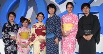 16年7月、映画「君の名は」舞台あいさつに浴衣姿で臨んだ市原悦子さん(左端)