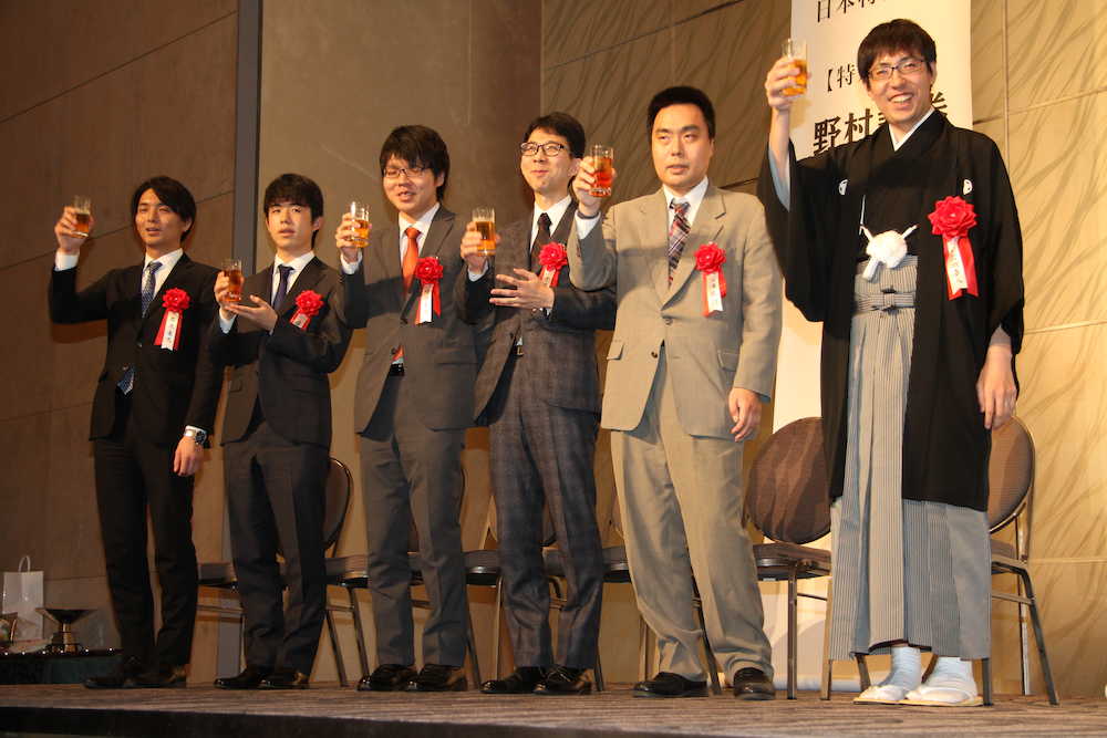 就位式で乾杯する広瀬章人新竜王(右端)。左から2人目は5組優勝の藤井聡太七段(撮影・我満 晴朗)