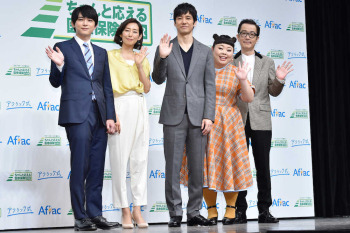 アフラック「ライフステージの変化に<ちゃんと応える医療保険EVER>」新商品発表会が17日、都内で行われ、西島秀俊(47)、渡辺直美(31)、吉沢亮(24)、木村多江(47)、リリー・フランキー(55)が出席した。同CMシリーズで夫婦役としておなじみの西島と渡辺に加え、今回新たに吉沢、木村、リリーの3人がCMキャラクターに就任。それぞれ共演経験はあるか尋ねられると、西島は「僕は木村さんと夫婦だったこともあります」と打ち明け、渡辺から「いろんな方と夫婦をやられているんですね」と突っ込まれて笑いを誘った。