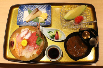 久保利明王将の注文はカツ煮定食(トンカツ煮、サラダ、いくらのせ胡桃豆腐、ごはん、味噌汁、漬け物、フルーツ)。渡辺は海鮮丼(海鮮丼、ブリの塩焼き魚、赤だし、漬け物、フルーツ)。渡辺からは苦手なわさび抜きの注文も入った。
