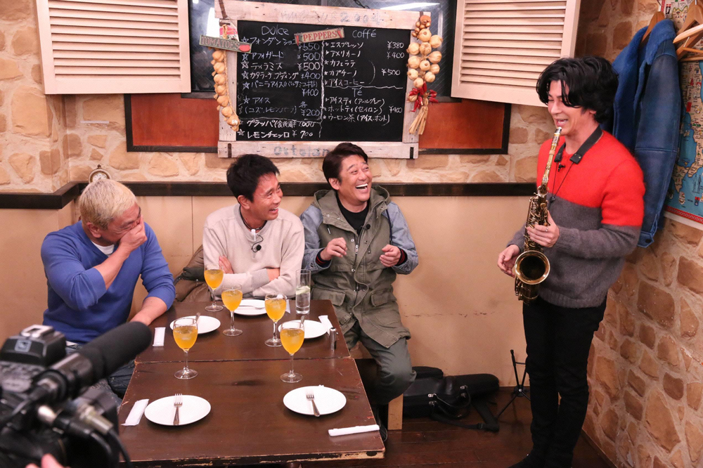 「ダウンタウンなう」でサックスを生演奏する武田真治(右)(C)フジテレビ