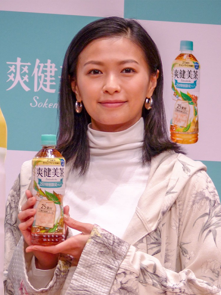 新たにメインのブランドアンバサダーに任命され「私自身も健やかに、爽やかに、美しくいたい」と抱負。今月12日に誕生日を迎えるのを前に、爽健美茶の材料となる植物の花束で祝福され「意識してなかったけど、誕生日なんだなと感じた。爽健美茶の25周年に絡めてしまって申し訳ないです」と話し笑顔を見せた。