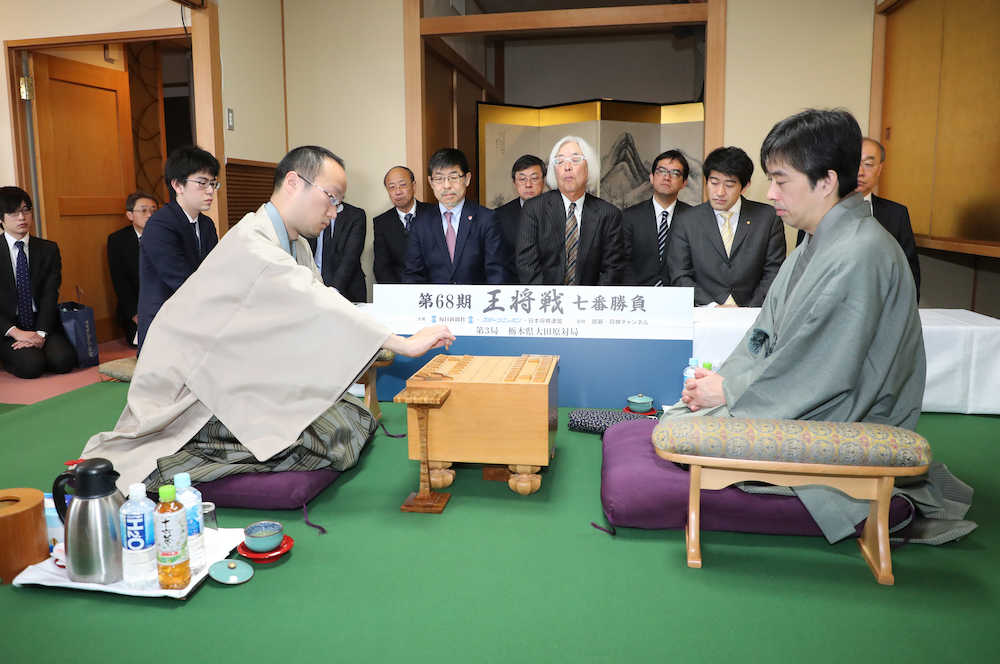 <王将戦第3局・初日>正立会人の田丸昇九段(左)に封じ手を手渡す久保王将(中央は渡辺棋王)(撮影・吉田 剛) Photo by スポニチ 王将戦第3局 久保王将が54手目を封じ第1日が終了 ギャラリーで見る この記事のフォト 2019年02月06日の画像一覧 もっと見る 2019年02月06日の画像をもっと見る