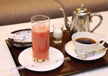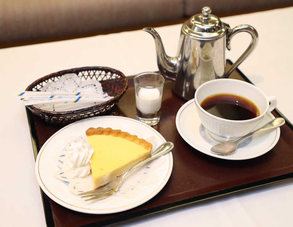 <王将戦第3局・初日>10時30分、久保王将のおやつはベークドチーズケーキとホットコーヒー(撮影・吉田 剛)