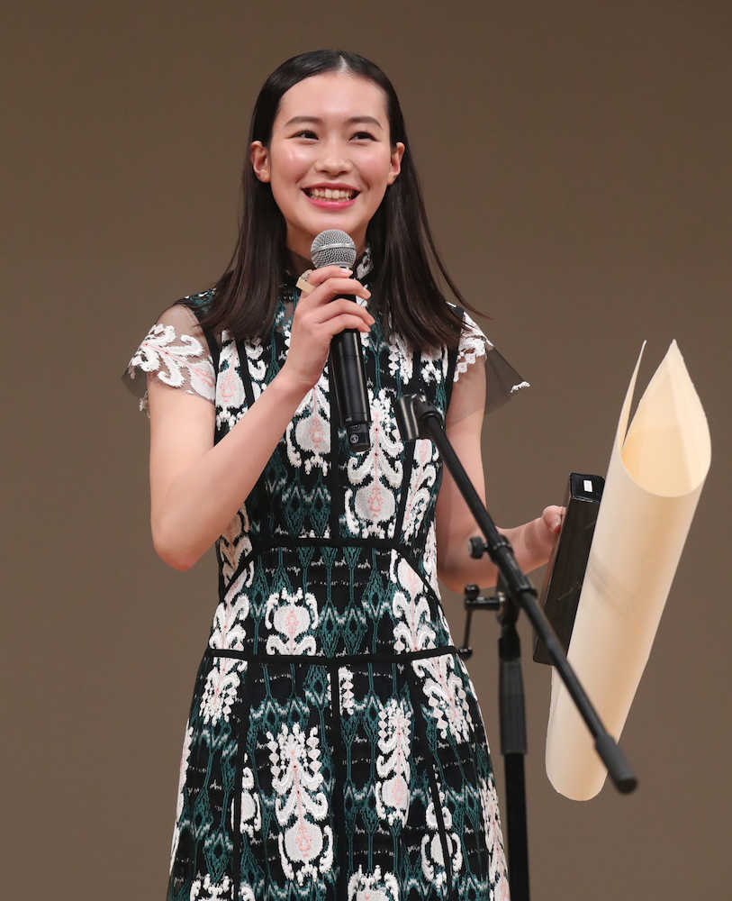 新人賞は、昨年もノミネートされた南沙良(16)が悲願の受賞。初主演作「志乃ちゃんは自分の名前が言えない」で吃音(きつおん)症の女子高生を好演した。関係者によると大勢の前で話すのが苦手というが、この日は堂々とあいさつ。母親が客席から晴れ姿を見守る中「この気持ちを忘れず、おごることなく、ひとつひとつはしごを上っていきたい」と語った。