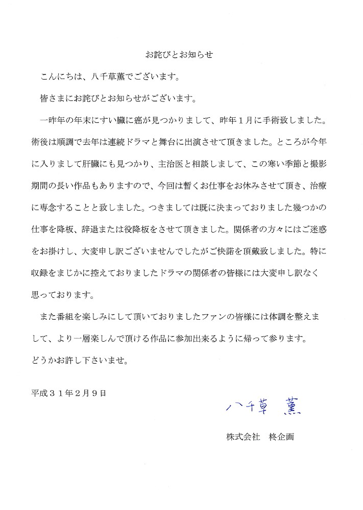 一昨年の年末にすい臓に癌が見つかりまして、昨年1月に手術をいたしました。術後は順調で去年は連続ドラマと舞台に出演させて頂きました。ところが今年に入りまして肝臓にも見つかり、主治医と相談しまして、この寒い季節と撮影期間の長い作品もありますので、今回は暫くお休みさせて頂き、治療に専念することと致しました。つきましては既に決まっておりました幾つかの仕事を降板、辞退または役降板をさせて頂きました。関係者の方々にはご迷惑をお掛けし、大変申し訳ございませんでしたがご快諾を頂戴致しました。特に収録が間近に控えておりましたドラマの関係者の皆様には大変申し訳なく思っております。