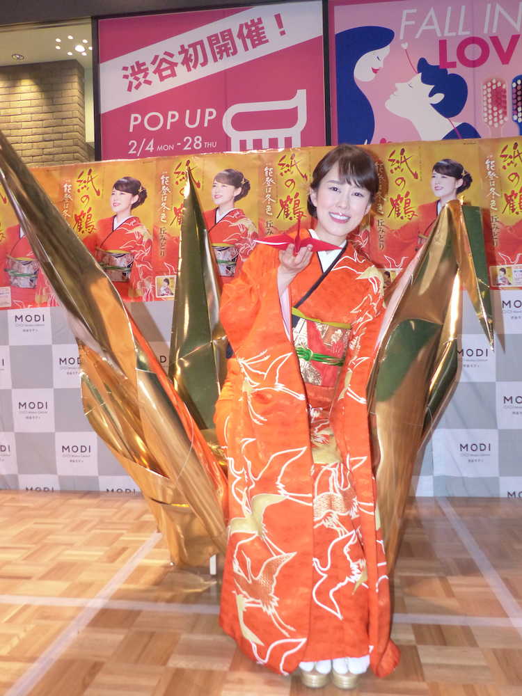 昨年までの3年間は、ミステリアス3部作として悲恋の曲を歌ってきたが、今年は明るい曲。「皆さんに笑顔の丘みどりを見てもらいたい」とニッコリ。曲名にちなんで3メートル四方の折り紙で作られた「金の鶴」に腰掛け「演歌界の金メダルを目指します!」と力強く宣言。3年連続のNHK紅白歌合戦出場を目指す。