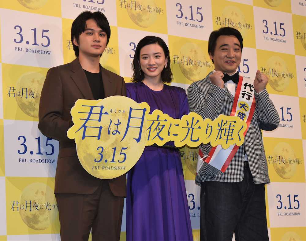 映画「君は月夜に光り輝く」の公開前イベントに出席した(左から)北村匠海、永野芽郁、「ジャングルポケット」斉藤慎二
