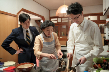 連続テレビ小説「まんぷく」第140話。まんぷくヌードルの具材となる肉を作る福子(安藤さくら)と萬平(長谷川博己)(C)NHK