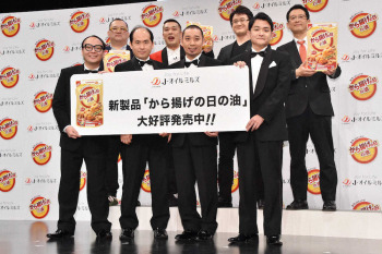 「から揚げの日の油」開封式が26日、都内で行われ、お笑いコンビ「千鳥」の大悟(39)、ノブ(39)、お笑いコンビ「トレンディエンジェル」の斎藤司(40)、たかし(33)、お笑いコンビ「ガリットチュウ」の福島善成(41)、熊谷茶(41)が出席した。