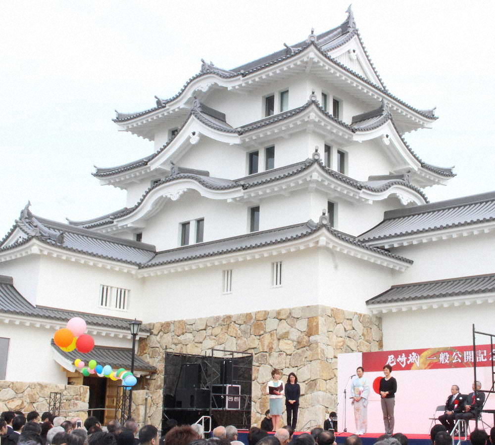 江戸初期に尼崎藩主・戸田氏鉄の居城として築かれ、1873年の廃城令で取り壊された“幻の城”がよみがえった。同市内で家電量販店の旧「ミドリ電化」を創業した安保詮氏が私費を拠出し、完成後に市へ寄贈した。