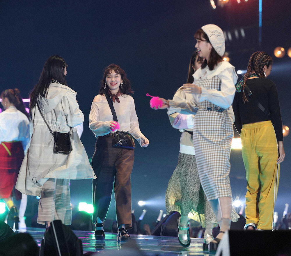 <東京ガールズコレクション>ランウェーを歩く際、出演者とぶつかり謝る飯豊まりえ(撮影・木村 揚輔)