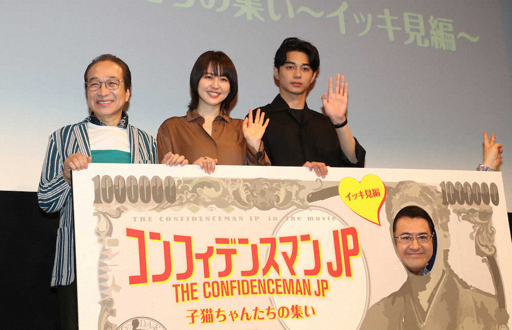 女優の長澤まさみ(31)が7日、都内で行われた主演映画「コンフィデンスマンJP」(5月17日公開)のイベントに出席した。昨年4月期にフジテレビ系で放送された連ドラの映画化。この日はドラマ全10話を劇中の時系列に沿って上映した。長澤は、約8時間半に及ぶ観賞を終えたファンへ「偉いな~。本当に長い時間、お疲れさまでした」とあいさつした。俳優の東出昌大(31)ら共演者たちも出席した。