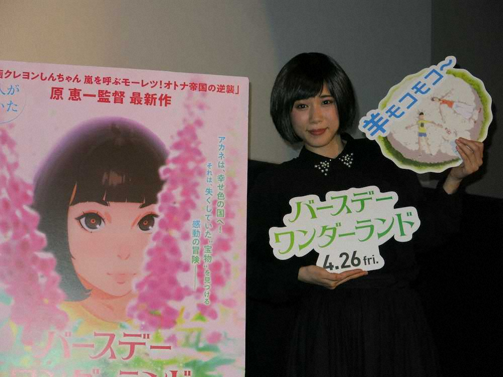 今回はアニメで初主演を務める松岡茉優(24)に似ていることでナビゲーターに抜擢された。「ウィッグをつけて。もちろん、寄せてます」とニンマリ。先日、松岡本人と会ったそうで「松岡さんもお会いしたかったと言ってくれました。同い年なんです。でも、実物はメチャ可愛くて、顔も全部、ひとまわり小さかった」と明かした。