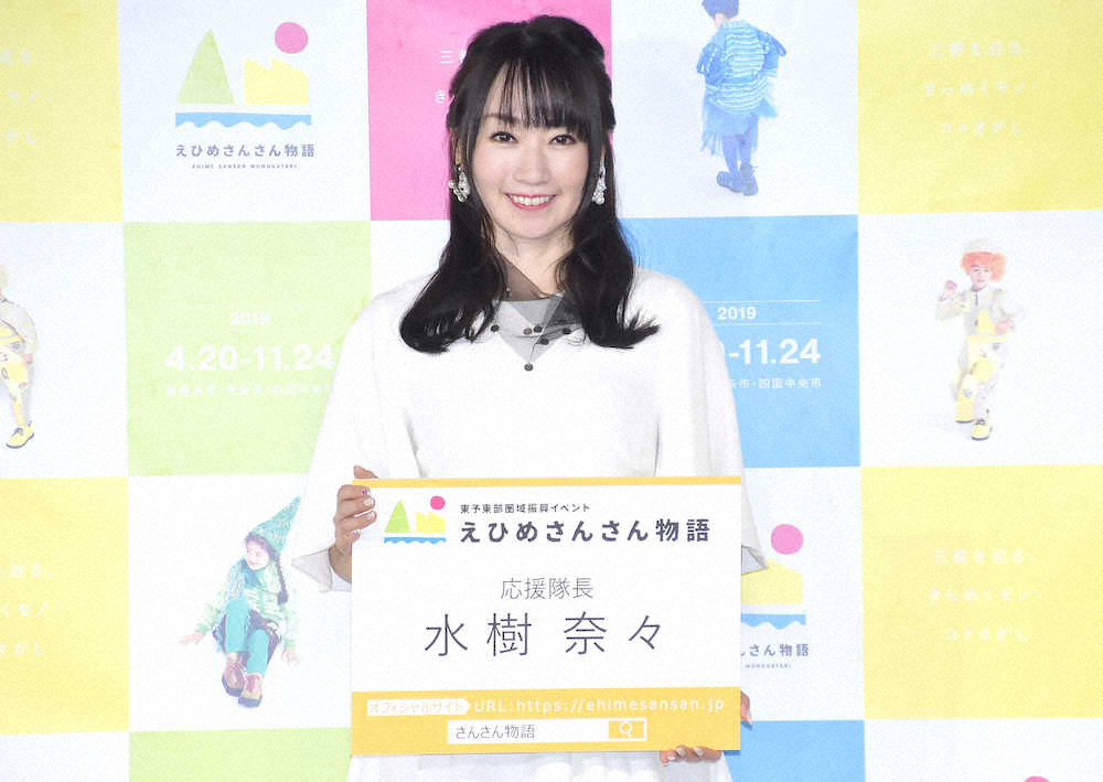 歌手で声優の水樹奈々(39)が15日、都内で愛媛県の振興イベント「えひめさんさん物語」の発表会に出席した。