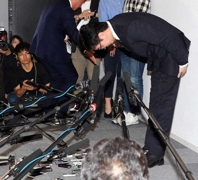 上下黒のスーツに黒縁の眼鏡姿。釈放後に金髪だった髪を黒に染めて会見場に現れた浦田は、まず大きく一礼。「私のあってはならない行動により、被害者の方へ大変なご迷惑をおかけしました」と何度も頭を下げた。