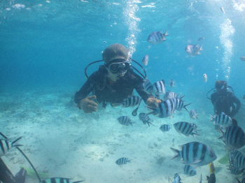 透き通った青い世界が広がる沖縄県恩納村の海。ウエットスーツに身を包み、ボンベを背負ってサンゴ礁の隙間を泳いでいく。手に持ったエサにはクマノミ、ヤガラ、イシダイなど色とりどりの南国の魚たちが集まり、思わず笑みがこぼれてしまう。水圧のため耳には痛みもあるが、眼前の美しい世界の中では気にならない。至福の20分間があっという間に過ぎてしまった。
