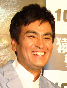 記者会見を欠席した蛭子能収のパネルと記念撮影に応じる太川陽介