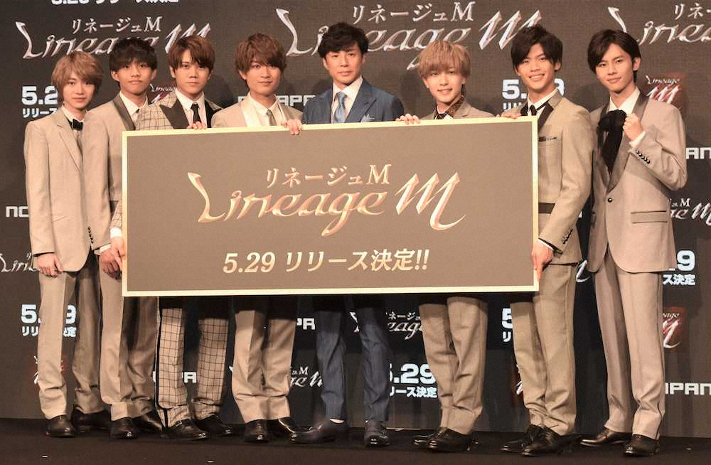 スマホゲーム「リネージュM」のリリース発表会に出席した(左から)今野大輝、五十嵐玲央、佐々木大光、本高克樹、東山紀之、中村嶺亜、菅田琳寧、矢花黎