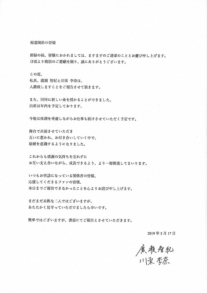 結婚を発表した川栄李奈と廣瀬智紀 Photo by スポニチ 川栄李奈 8歳年上の“刀剣乱舞俳優”廣瀬智紀と電撃結婚&年内出産!昨年秋… ギャラリーで見る この記事のフォト 2019年05月17日の画像一覧 もっと見る 2019年05月17日の画像をもっと見る