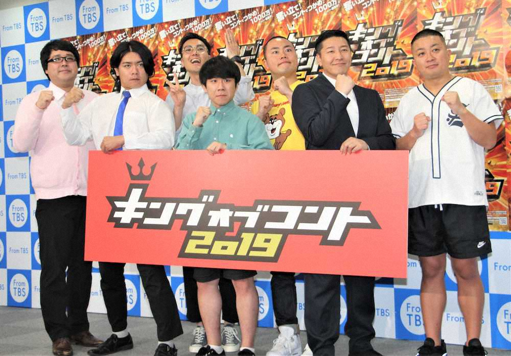 「キングオブコント」の第12回2019大会開催決定会見に出席した(左から)「マヂカルラブリー」村上、野田クリスタル、「ハナコ」菊田竜大、秋山寛貴、岡部大、「チョコレートプラネット」長田庄平、松尾駿