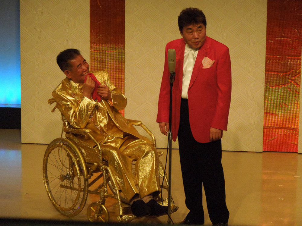 15年3月、金ピカ車椅子で舞台復帰した横山たかしさん(左)と相方の横山ひろし