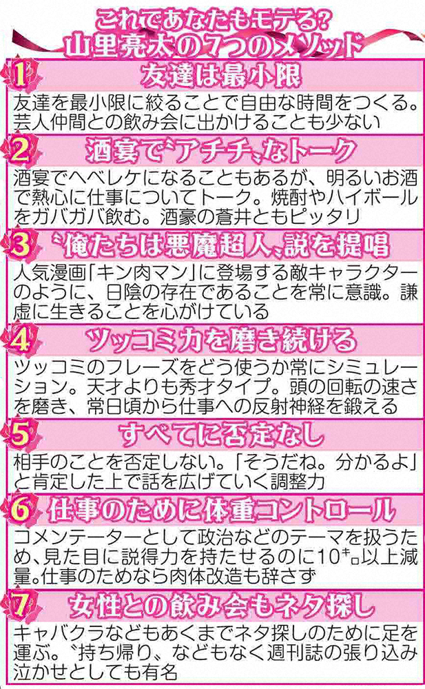 “非モテ”の象徴の山里が、なぜこれほどの高根の花をトリコにできたのか。周囲からは「山ちゃんはブサイクと呼ばれていますが、中身は男前」との声が上がる。そこには仕事にもつながる“山ちゃんメソッド”が浮かび上がってきた。