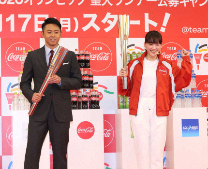 女優の綾瀬はるか(34)が10日、都内で開かれた日本コカ・コーラ社の東京五輪聖火ランナー公募キャンペーンの発表会に出席した。チームコカ・コーラのアンバサダーに就任し、聖火のトーチを持って登場。「ますます盛り上げていきます!オウ!」と握り拳を突き上げた。聖火リレーの疑似体験では「重みを感じて緊張感があった。腕がプルプルするかも」と驚きながら、「声援があって興奮しました。楽しかった」と笑顔で話した。
