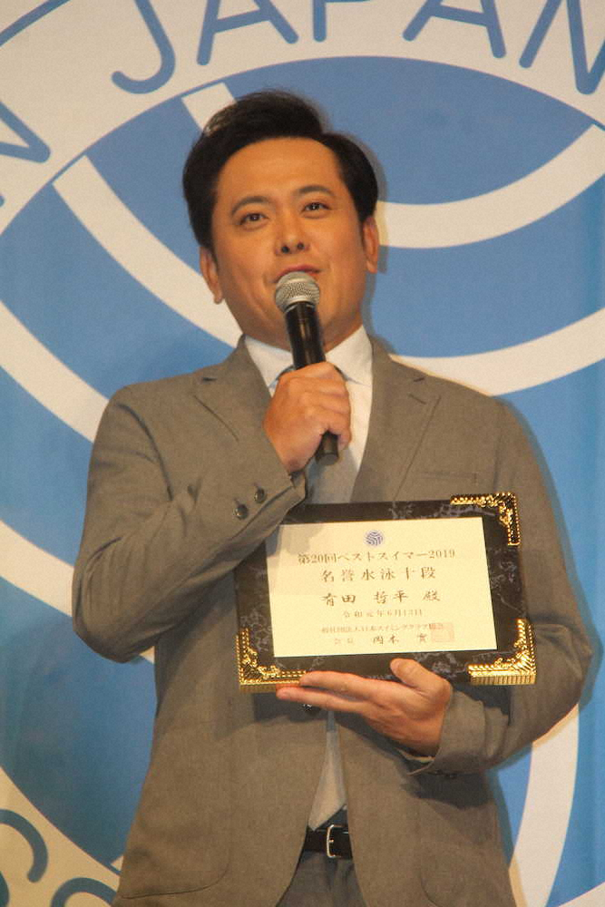 お笑いコンビ「くりぃむしちゅー」の有田哲平(48)が13日、都内で行われた「第20回ベストスイマー2019表彰式」にファッションモデルの蛯原友里(39)、俳優の中尾明慶(30)とともに出席。受賞の喜びをユーモアに語った。