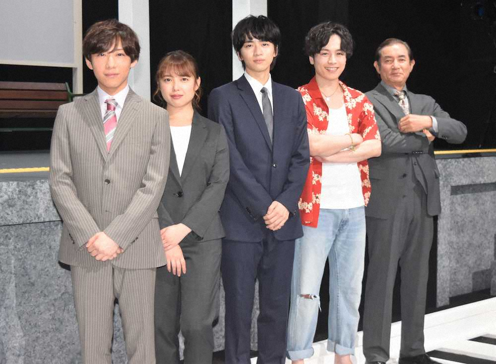 舞台「ちょっと今から仕事やめてくる」に出演した(左から)葉山昴、中島早貴、飯島寛騎、鈴木勝吾、田中健