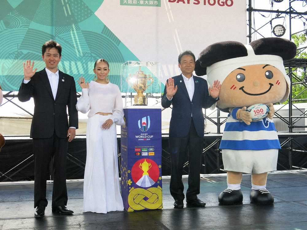 舞台上にはラグビーW杯優勝トロフィー「ウェブ・エリス・カップ」が展示され、吉村洋文大阪府知事(43)は「ボクも高校時代はラガーマンでした。前回のW杯も感動して涙した。今回もラグビーを通じて大阪を盛り上げましょう」と気勢を挙げ、「パワフルで、大阪が元気になれる」と倖田の「Eh Yo」を大絶賛した。