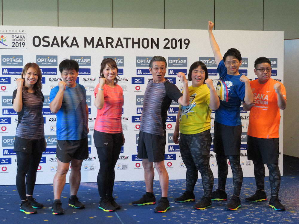 今年から新コースになる「第9回大阪マラソン」をアピールする(左から)福本愛菜、ジミー大西、岡崎朋美、間寛平、ゆりやんレトリィバァ、「ミキ」亜生、昂生